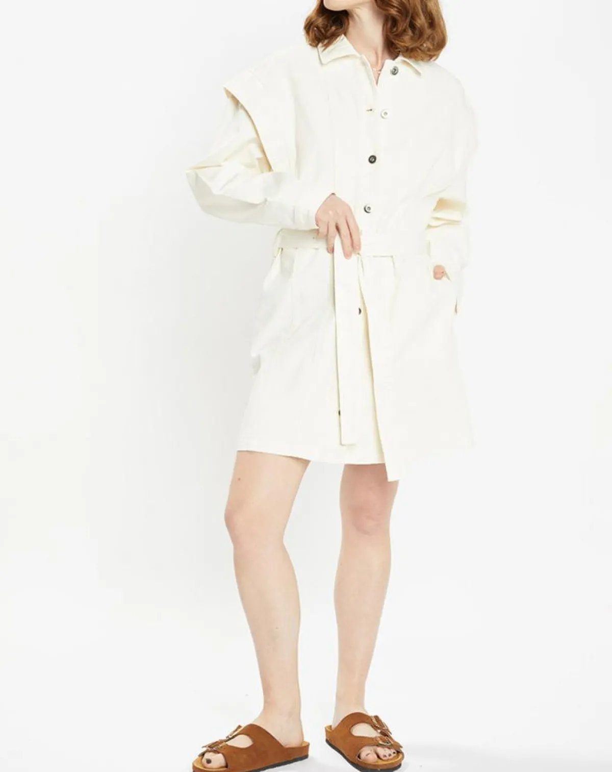 Cette robe courte Galeries Lafayette en coton jean est munie d’un col classique, d’une fermeture boutonnée métallique, de poches, de parements aux emmanchures et d’une ceinture à nouer.