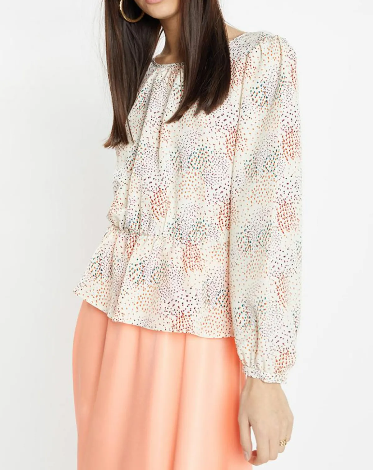 Cette blouse fluide Galeries Lafayette présente un imprimé moucheté, des manches longues, un col rond avant, un décolleté V au dos avec liens à nouer et une basque.