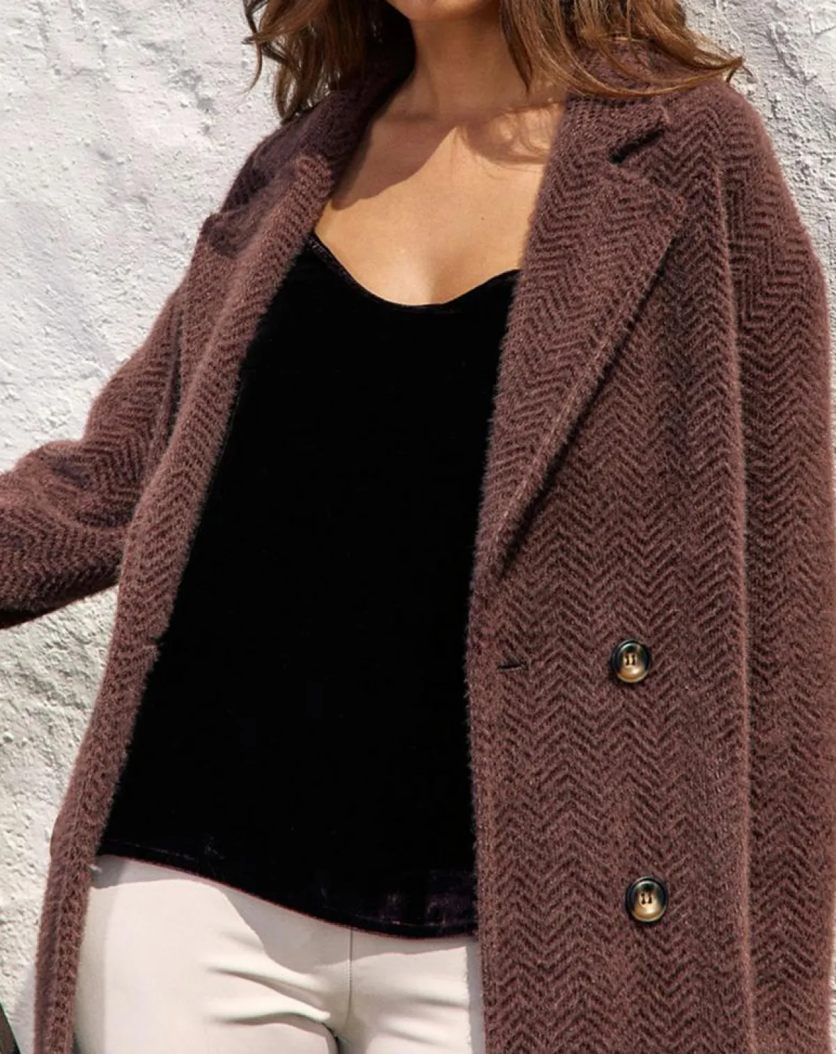 Manteau long fluide en maille duveteuse, large col, double boutonnage, manches avec larges poignets
