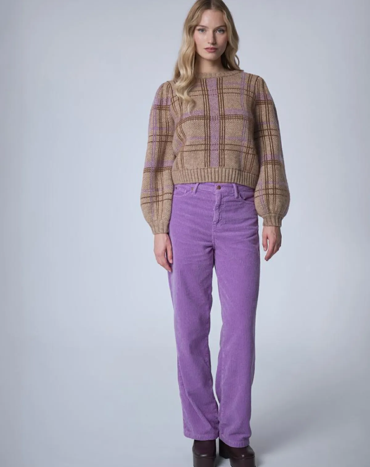 Bord côte côtelé à l’encolure sur le bas des manches et du pull.