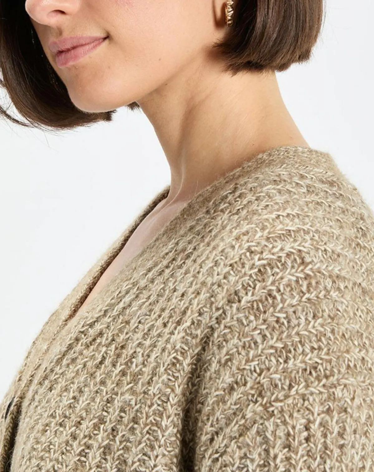 Allure scandinave nonchalante : le cardigan douillet à encolure en V, en fil mouliné multicolore.