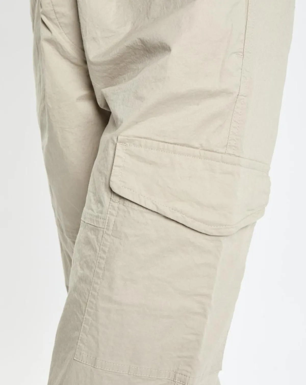Modèle avec ceinture caractéristique et élastique, poches fendues pratiques, prises dans la couture sur les côtés, poches passepoilées sur le fessier et une grande poche cargo plaquée d’un côté.