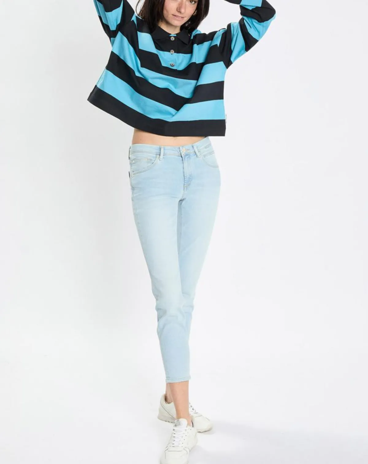 L’incarnation du style universitaire chic des beaux quartiers, revisitée et modernisée : le polo oversize décontracté et raccourci au style preppy à larges rayures.