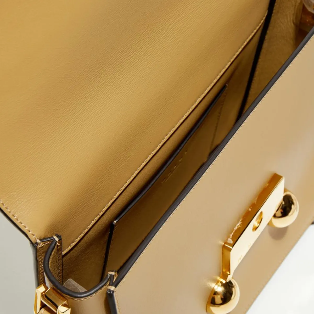 Sac à banoulière Marni Trunkaroo de taille moyenne en cuir beige avec détails en laiton doré, bandoulière réglable et amovible, fermeture magnétique oversize, logo gravé, détails métalliques, deux demi-sphères appliquées, une poche plate intérieure, un compartiment principal