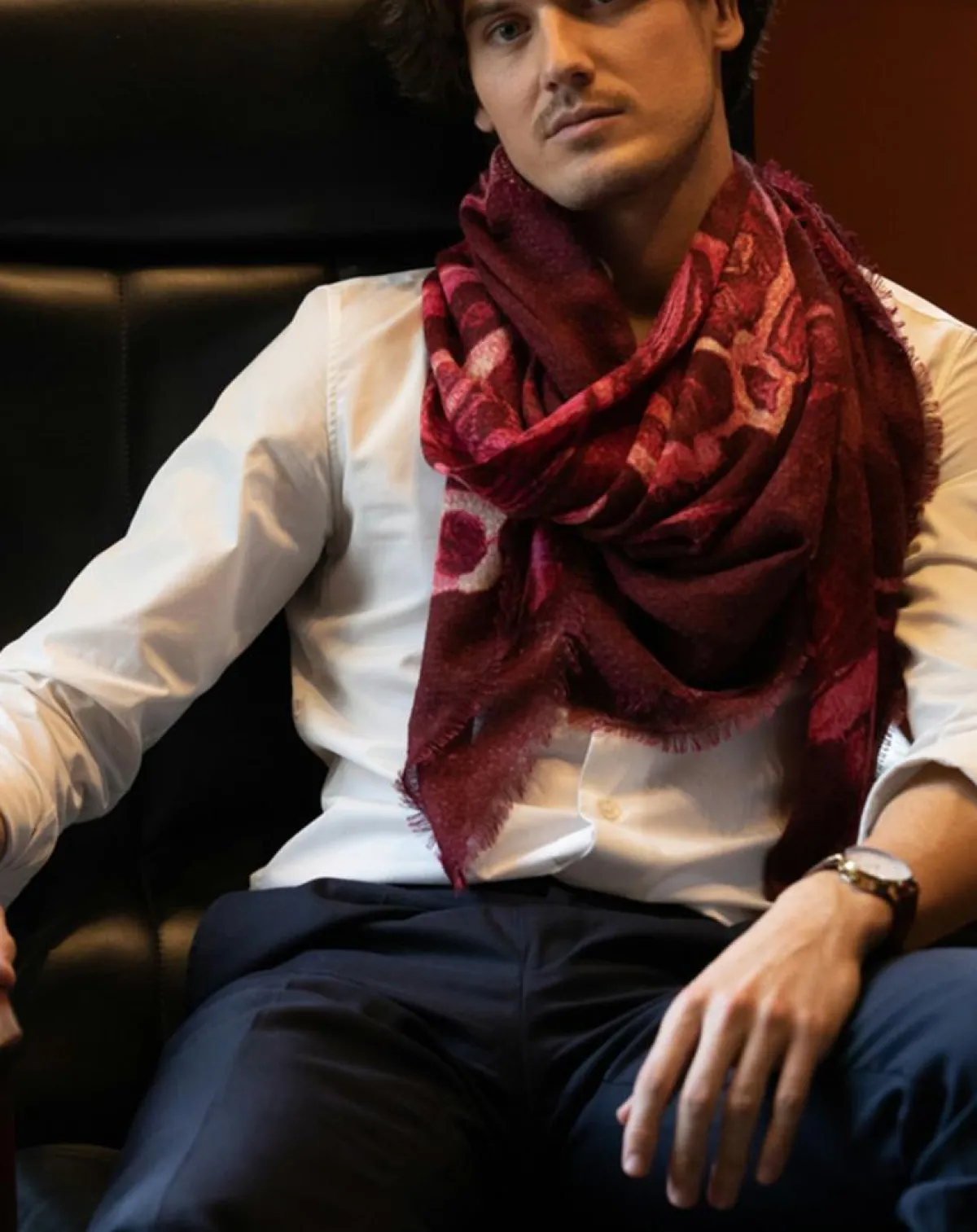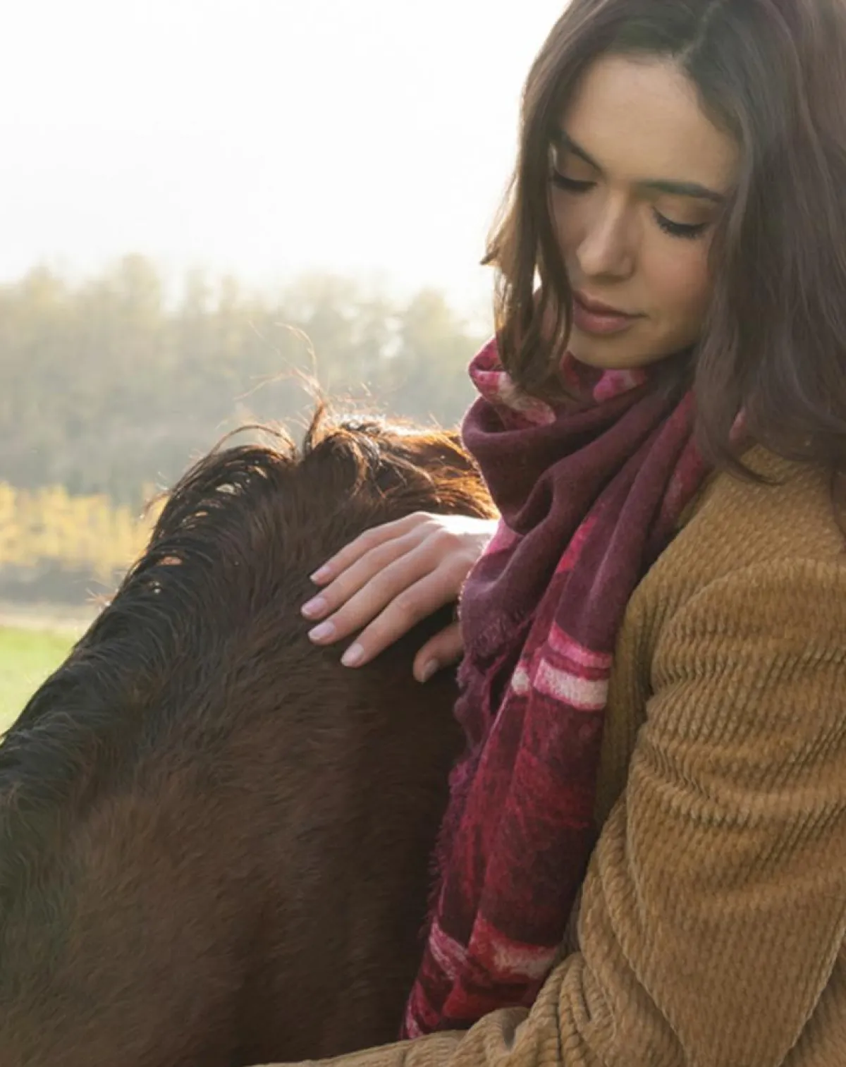 Comme ce grand carré de laine et soie : une étole indispensable qui ne nous quitte pas, comme le style