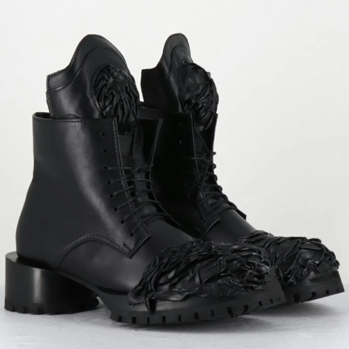 Boots à lacets en cuir noir ornées d’un écusson sur la languette esprit surréaliste