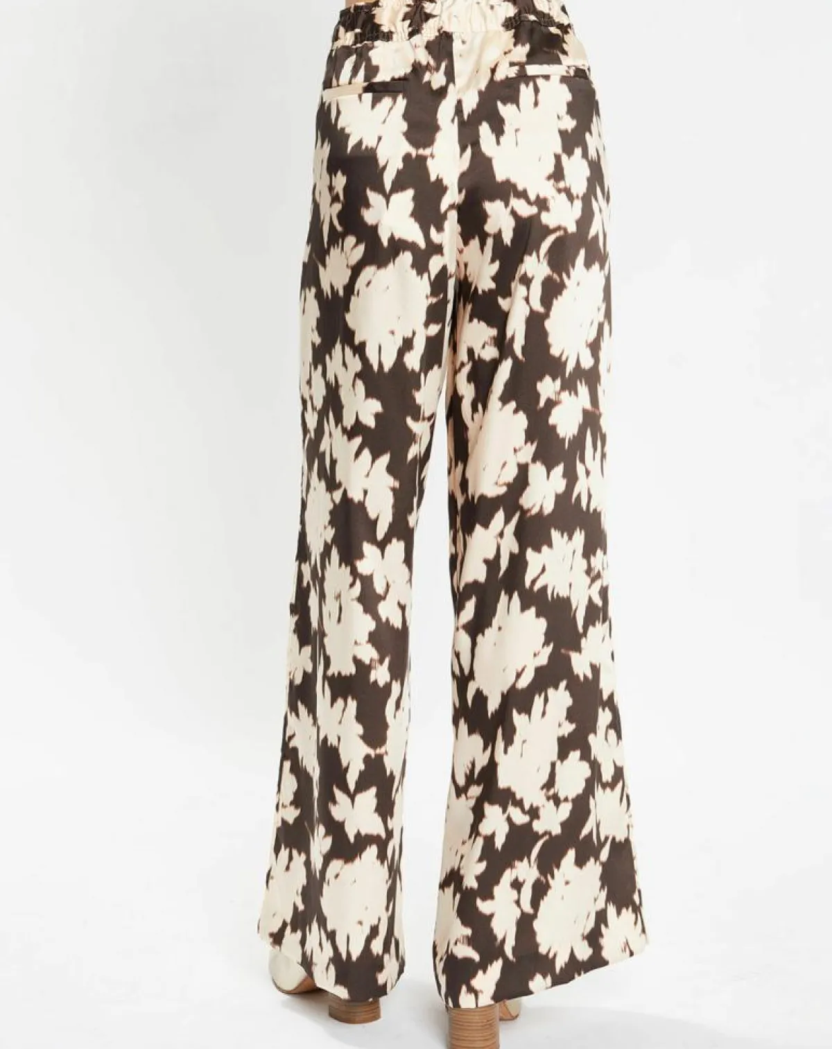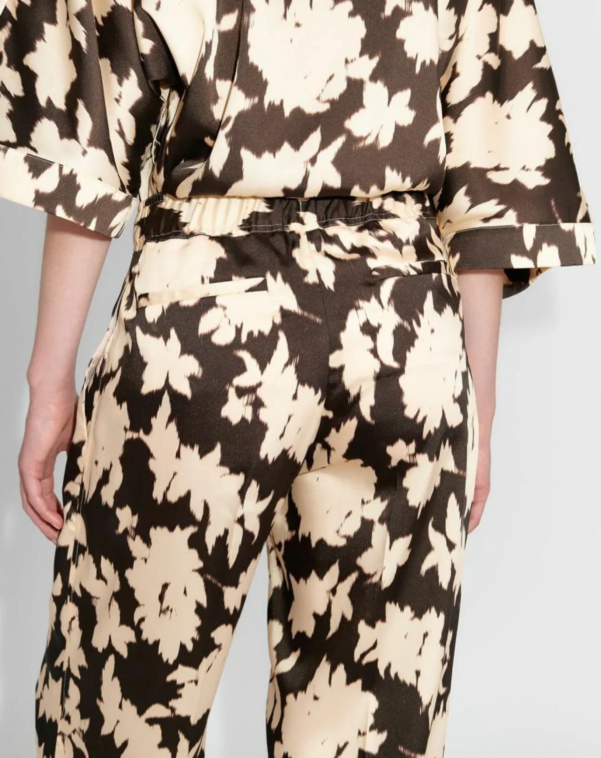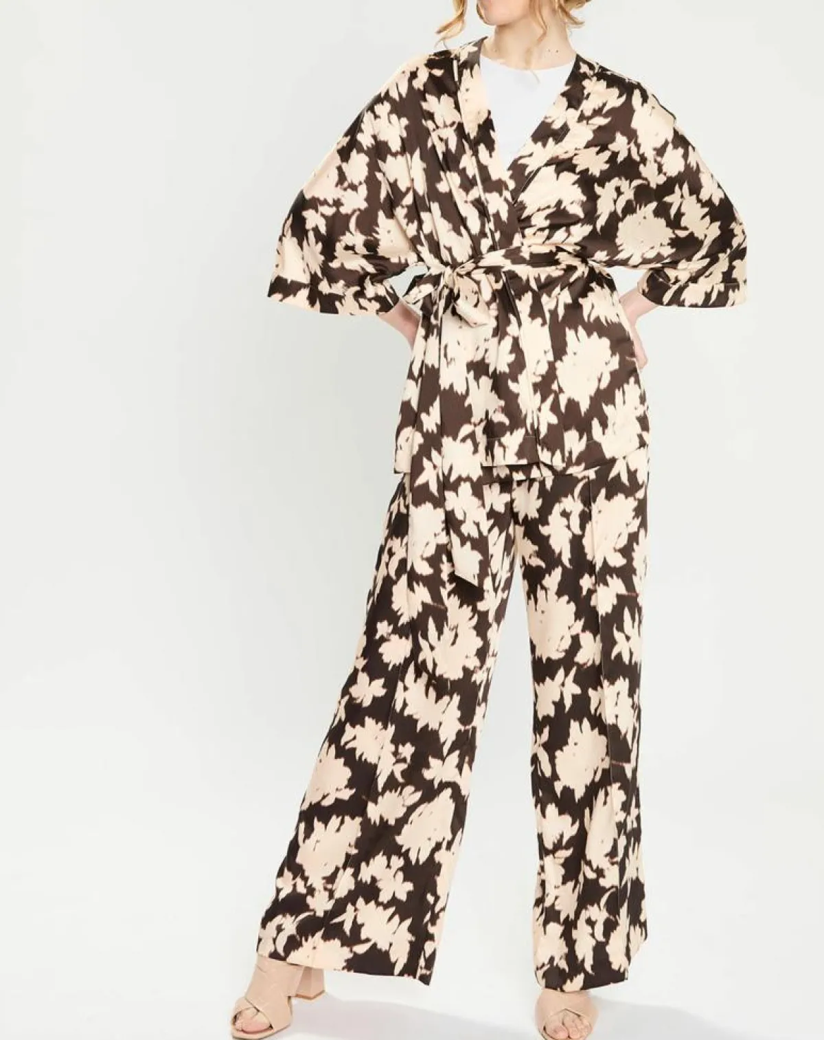 On adopte cette direction en optant pour un tissu fluide et large orné d’un imprimé beige et chocolat