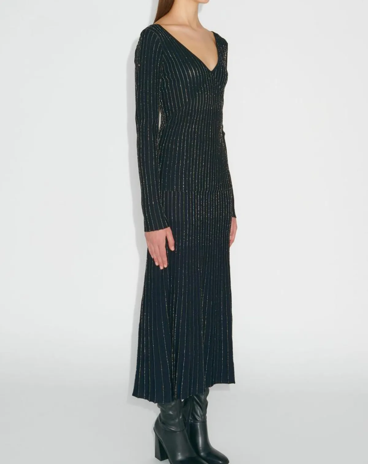 On l’associepour un ensemble rayé all-over métallique qui appelle aux fêtes