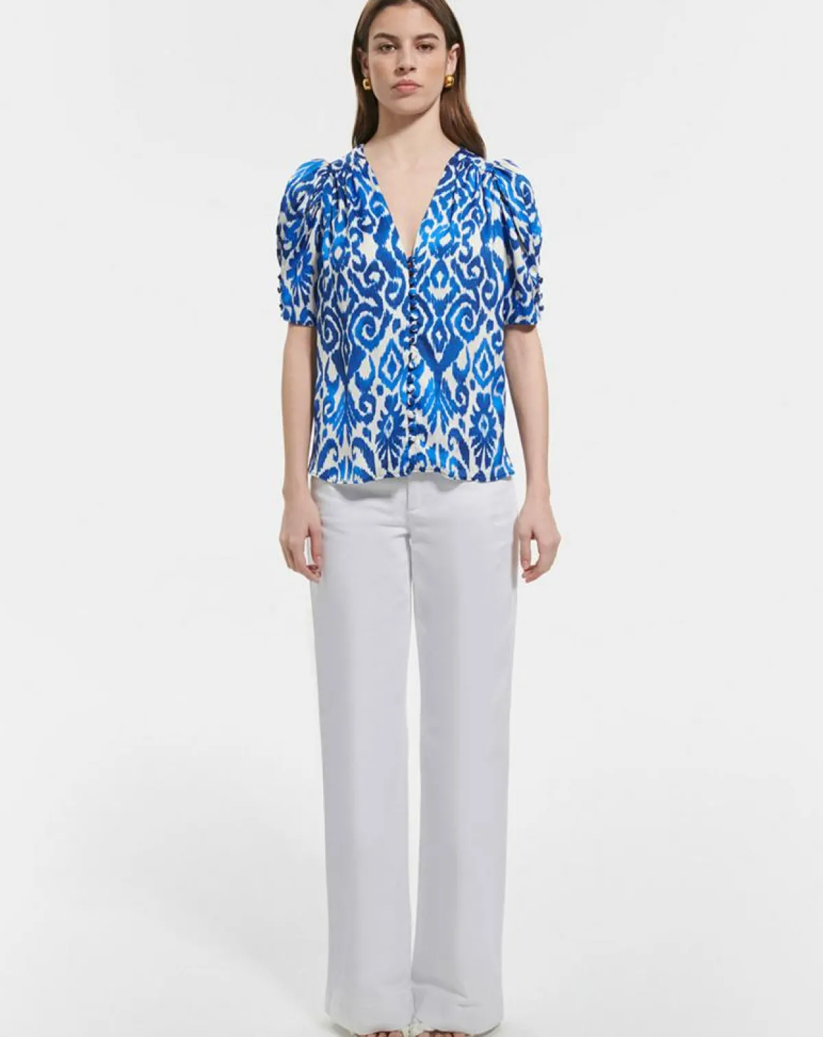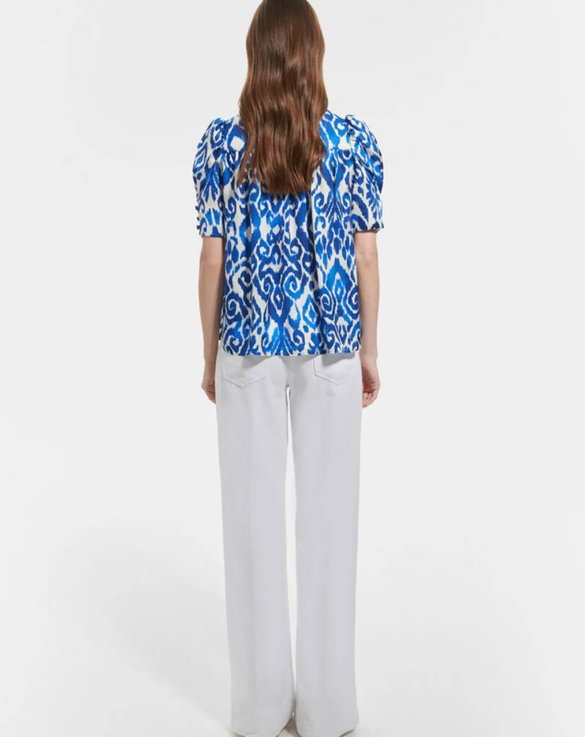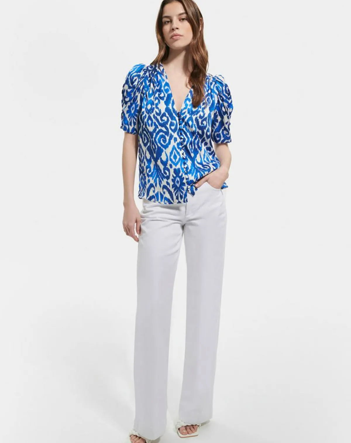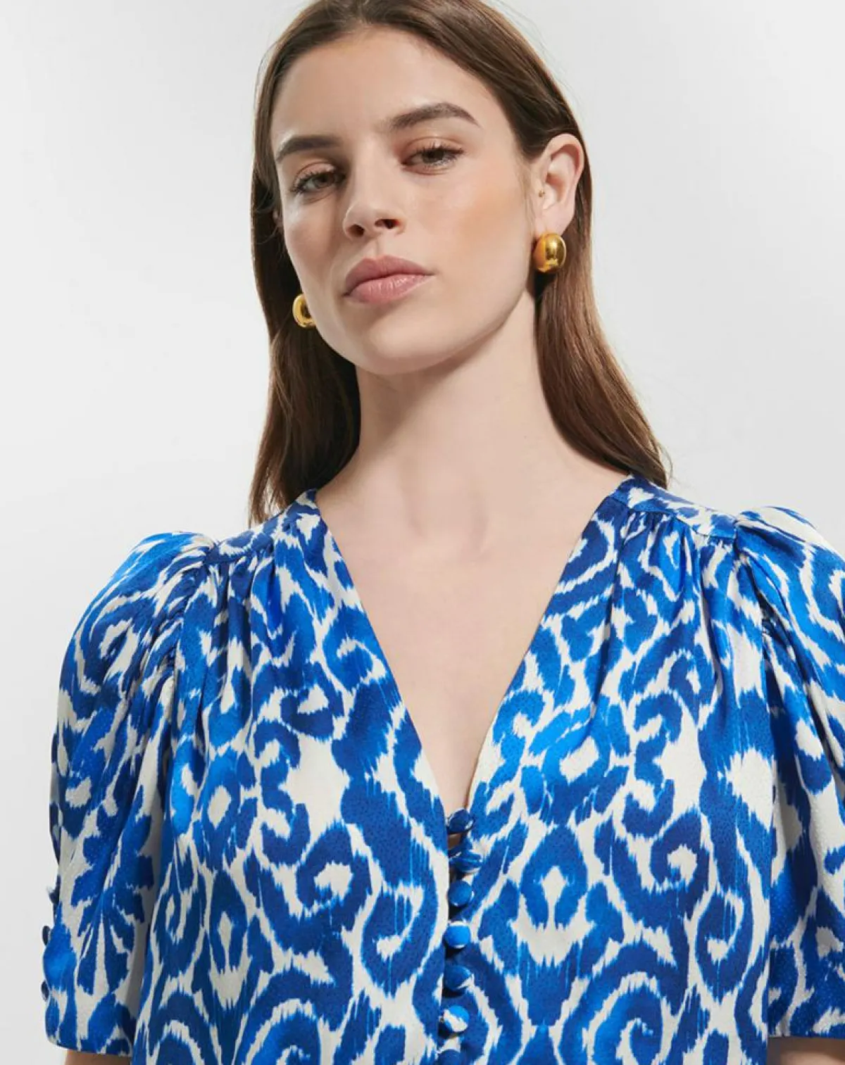 Optez pour cette chemise fluide irrésistible munie d’un imprimé vibrantBlue Waves!